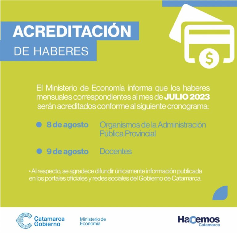 El Ministerio de Economía informa que los haberes mensuales correspondientes al mes de julio 2023 serán acreditados conforme al siguiente cronograma:
