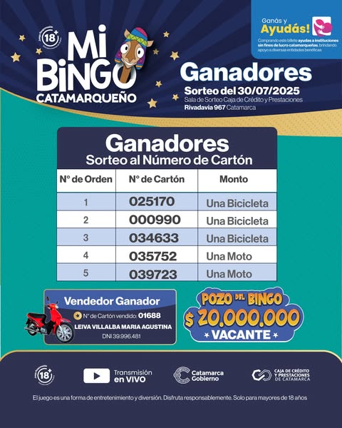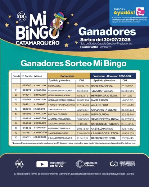 A continuación, se detalla la lista completa de los afortunados ganadores de Mi Bingo Catamarqueño: