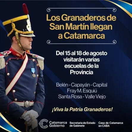 Un distinguido contingente de integrantes del Regimiento de Granaderos a Caballo «General San Martín» tiene previsto arribar a Catamarca el próximo martes 15, con el fin de participar en el Acto Central del 17 de agosto y tomar parte en diversas ceremonias escolares.